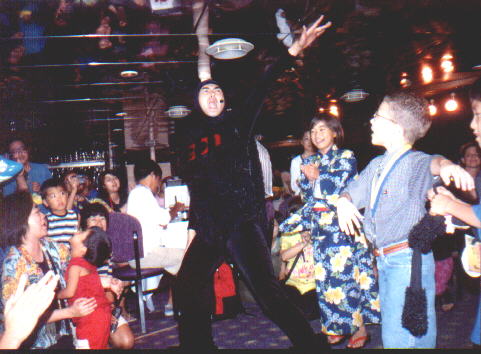 Of course the players took this to mean the start of the round, not to dance (Imakuni? did, however). He concluded with, ["Boy am I tired"], ran off the stage, and deliberately fell over.