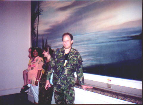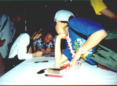 I made my way back to the hotel, to the Mid-Pacific Conference Center to see if anyone I know was waiting there. In a few moments, several of the Wizards of the Coast staff came up the escalators, including Ron Foster (the translator of the Pokemon Card game). In addition to him, I met additional Wizards employees, including Mike Gills (known as "Master Trainer" Mike), and Mike Boozer (known to some of the internal Wizards staff as "Dark Master Trainer" Mike) and Mike Elliot as Lt. Surge.