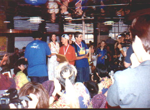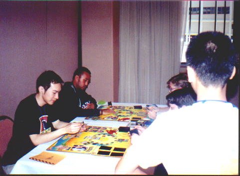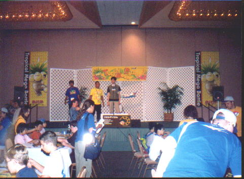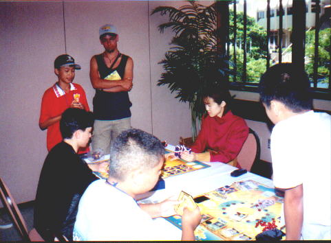 In a short time, the announcements began. A member of the Media Factory staff began to speak, and with Mr. Foster's interpreting, explained the "ground rules" of the tournament. Japanese tournament rules are slightly different than the ones used outside of Japan. The most striking aspect is that when a tournament judge makes a call on a rules question, the ruling is FINAL: no if's, and's or but's. Second, the matter was stressed that if a rules question arises, it should be brought to the attention of the judges as soon as possible.