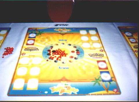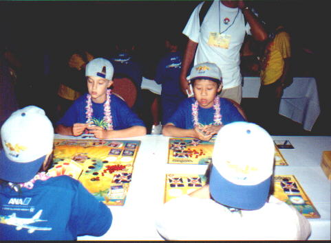 The initial room that the children were in was Nivi/Pewter City. The children played each other within their own teams. I saw a bit of what people fear when they go to tournaments: 80-90 percent of the decks were Haymaker variants decks, with FEW that were a mixture of other decks. The Japanese Gym personality of Takeshi/Brock (mis-pronounced "Bronx" by the Japanese speaker) walked around, and gave out the Japanese Boulder Badge to the winners. Reiko was one of the team leaders.