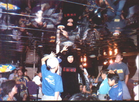An hour later at 1:00pm, the players came back in, and were placed according to their standings in the pre-lunch competition, and the battles began. Before the third round, the Japanese announcer was about to start the round when Imakuni? (in costume) ran up and pushed him out of the way, then yelled "Alright everyone! Let's DANCE!"